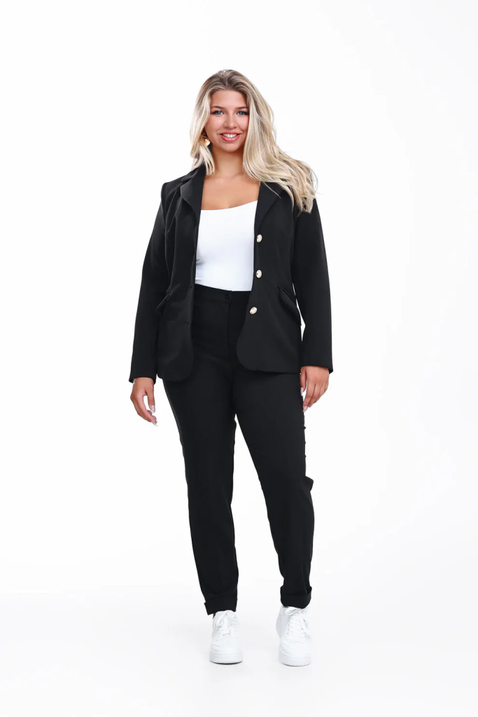 Magas dereka kiemeli a nőies vonalakat, a hajtások és részletek pedig finoman emelik ki a profizmust sugárzó megjelenést.