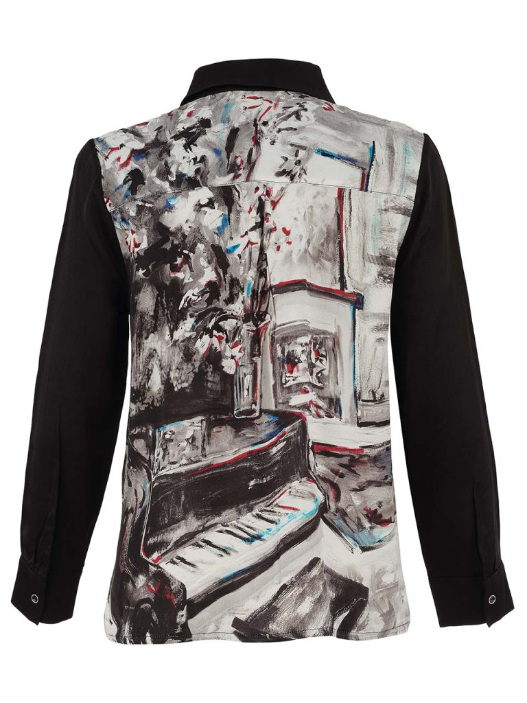 A Piano Blues blúz kontrasztos, merész, klasszikus gallérral és elülső gombokkal rendelkezik, amelyek kiemelik kifinomult dizájnját. Selymes kötött anyagból készült, kivételesen sima érzetet biztosít a kényelmes viselet érdekében. A blúz részletesen kidolgozott, fekete, teljes hosszúságú ujjakkal és gombos mandzsettával rendelkezik, amelyek elegáns kiegészítői a kifinomult ruhatáradnak.
