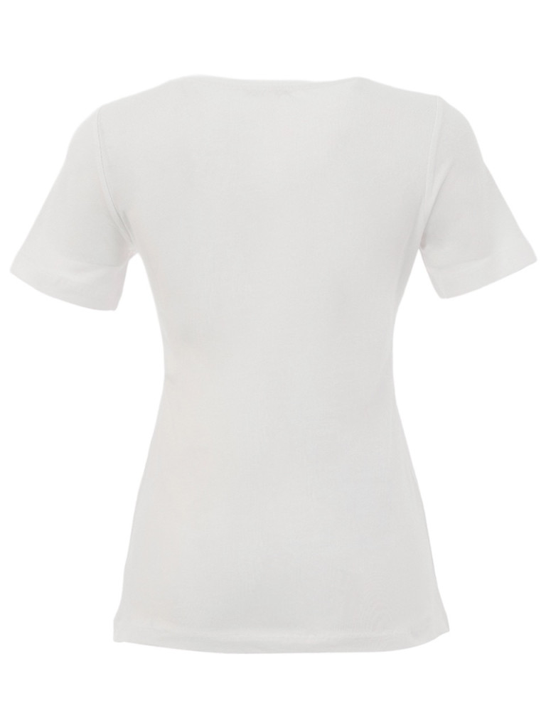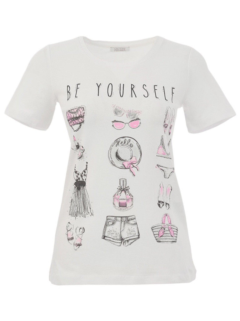 Puha pamut-elasztán keverékből készült, ez a fehér póló élénk elülső dizájnt mutat, amelyen flitteres illusztrációk láthatók ruhát, táskát,