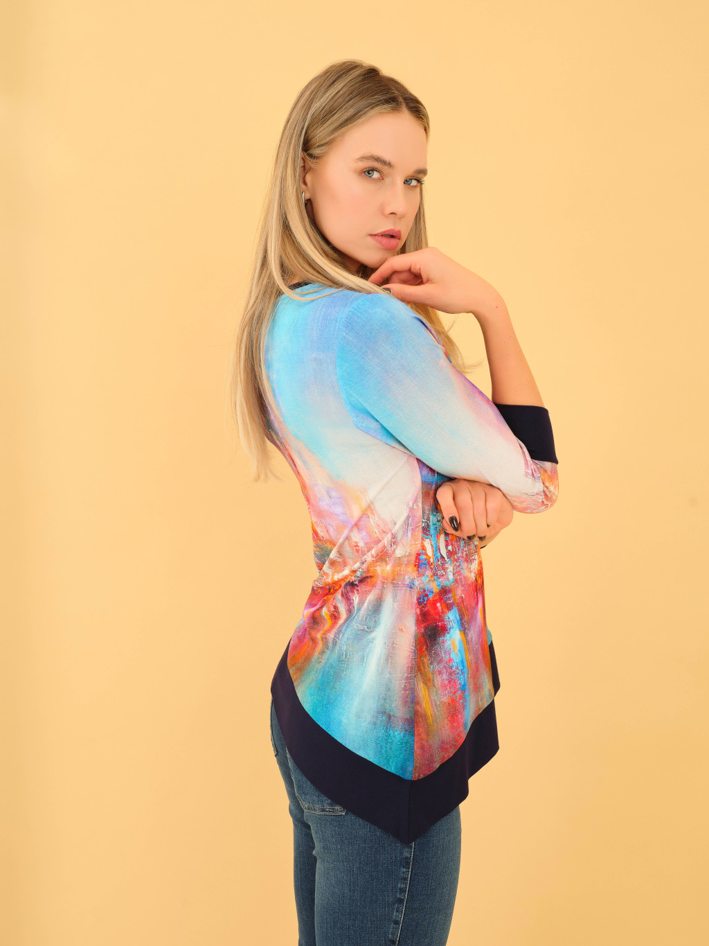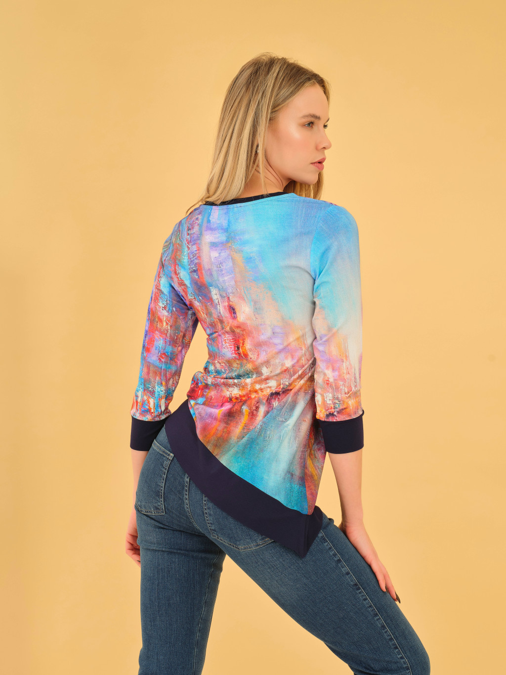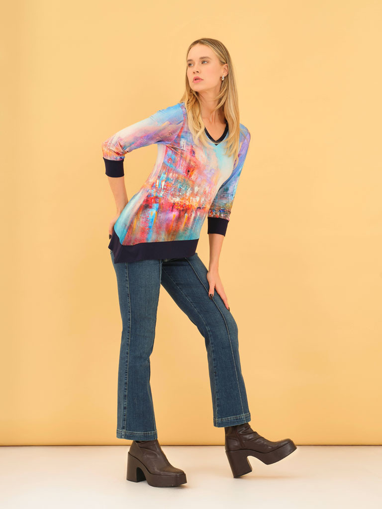 Simply Art by Dolcezza “A kék város” felső – gyönyörű aszimmetrikus felső V-nyakkal és kontrasztos szegélyekkel,