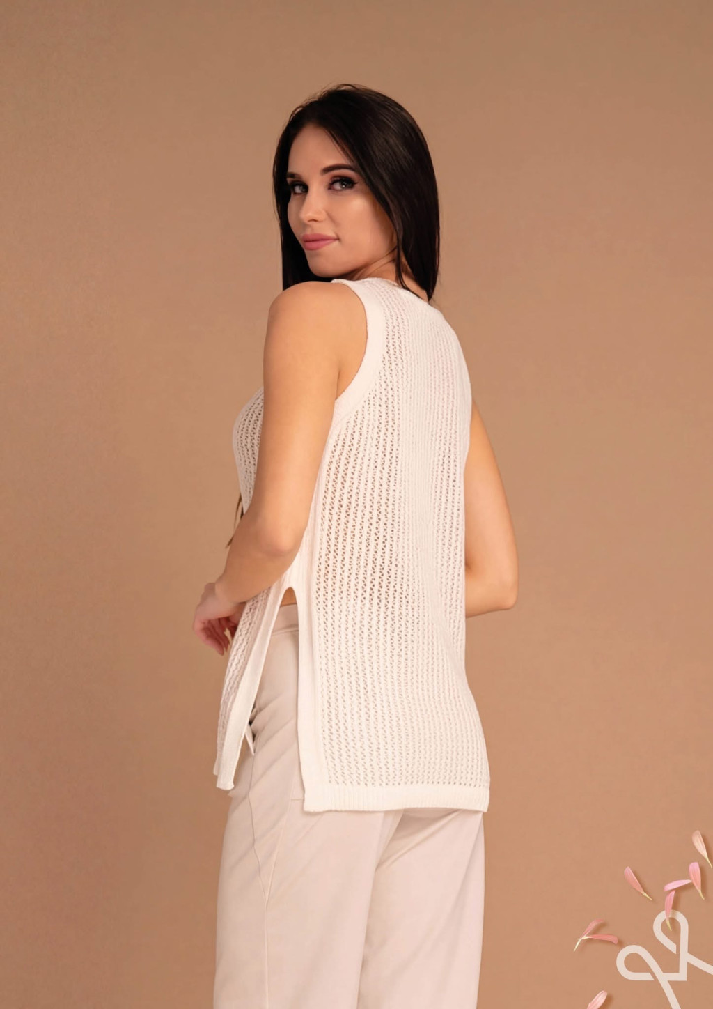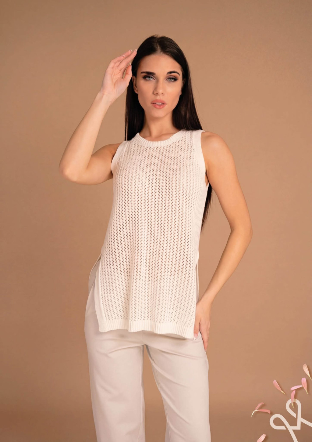Vaj színű, Magenta kötött felső, laza kötésű, ujjatlan, kerek nyakkivágással, oldalán sliccel. Oldalán rávarrt fém Magenta márkajelzés.