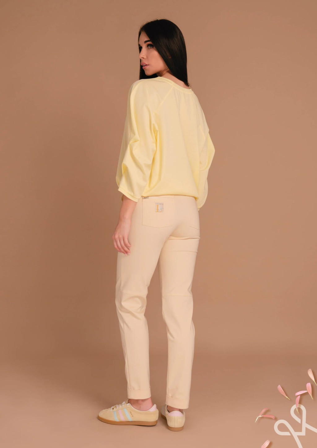 Sárga színű, kevert szálas Magenta felső, bő fazonú, ujján hajtásokkal díszített, kerek nyakkivágással. Hátul filmnyomott Magenta márkajelzés.