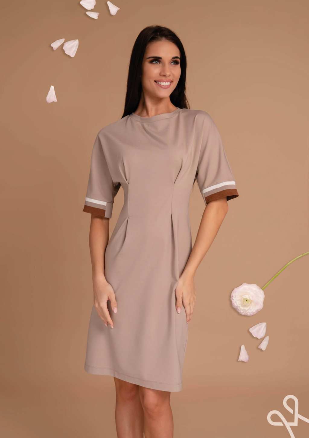 Bézs színű, elasztikus punto Magenta ruha, laza fazonú, kerek nyakkivágással, elején szűkítőkkel, ujján passzéval díszített. Hátul rávarrt textil Magenta márkajelzés.