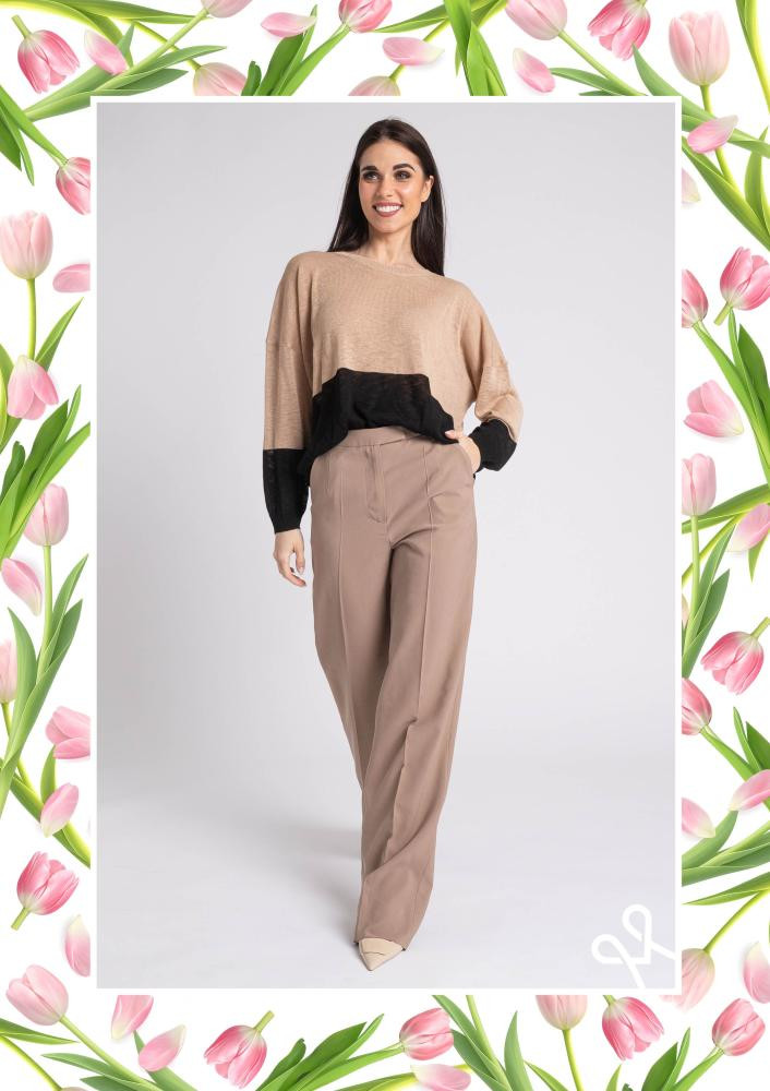 Bézs színű, kevert szálas Magenta nadrág, bővebb szárú, élvasalt, elején kapcsos és zippzáras záródással, övbújtatós derékrésszel, zsebekkel. Elején rávarrt Magenta márkajelzés.