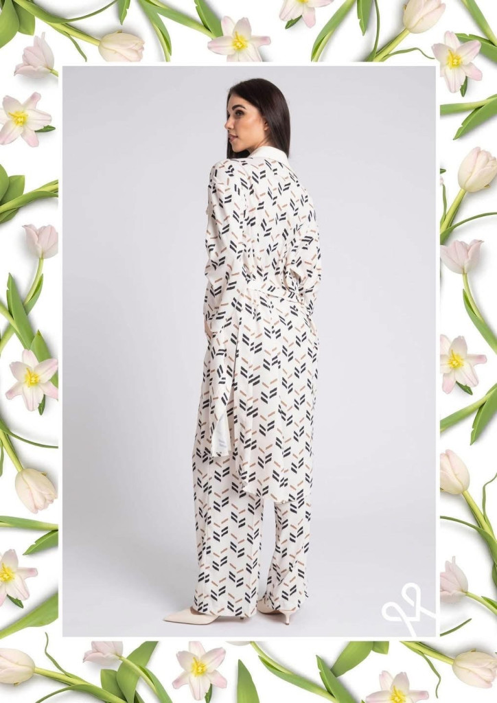 Mintás, vászon Magenta nadrág, élvasalt, egyenes szárral, oldalán zippzáras záródással, övbújtatós derékrésszel és megkötővel, zsebekkel. Hátul rávarrt Magenta márkajelzés.