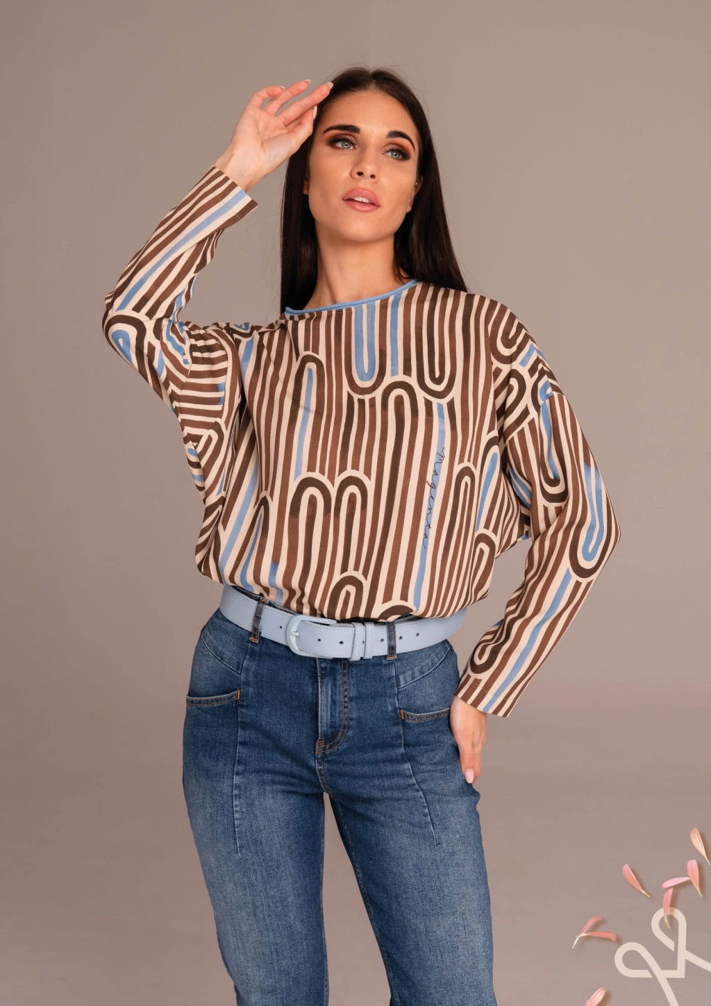 Mintás, Magenta felső, bő fazonú, hosszú bő ujjal, hátul pattentos záródással. Elején filmnyomott Magenta márkajelzés.