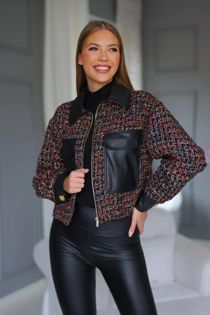 Buklé anyagból készült, galléros, cipzáros, bőr betétekkel és zsebekkel díszített kabátka