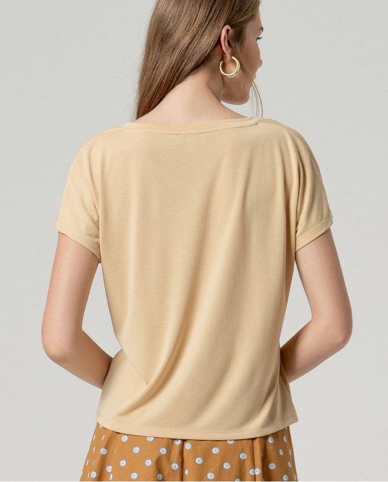 Rövid ujjú póló V-nyakkal és enyhén ejtett vállal.