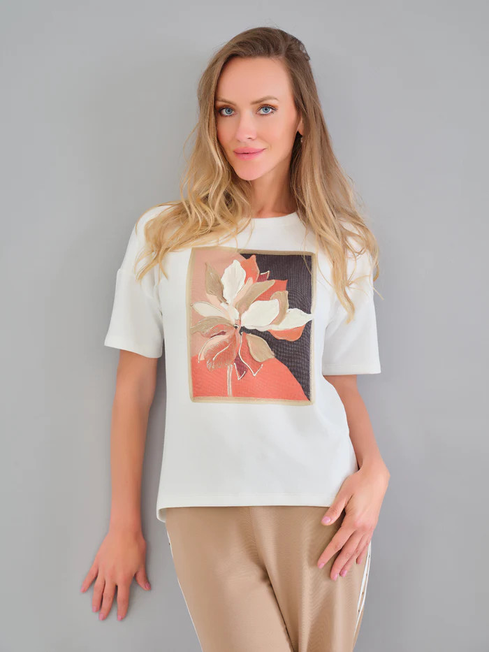 Prémium minőségű, texturált kötött pulóver, elöl texturált virágmintával. A minta csak az elején található, a háta törtfehér.