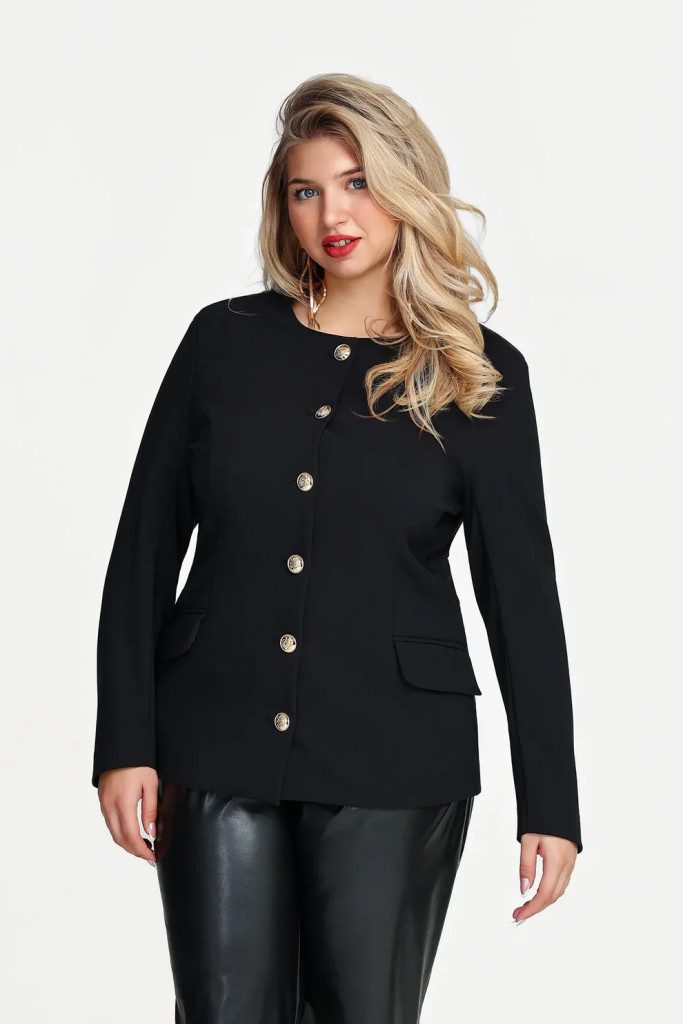 Gallér nélküli, kerek nyakkivágású szabása modern és nőies vonalat ad, míg az arany színű, dekoratív gombok igazán különlegessé teszik ezt a darabot.