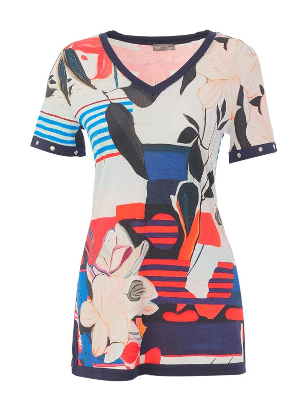 Az előnyös V-nyakkivágás és a hasított szegély könnyedén sikkes sziluettet alkot, míg a játékos ezüst szegecsek díszítik a rövid ujjakat.