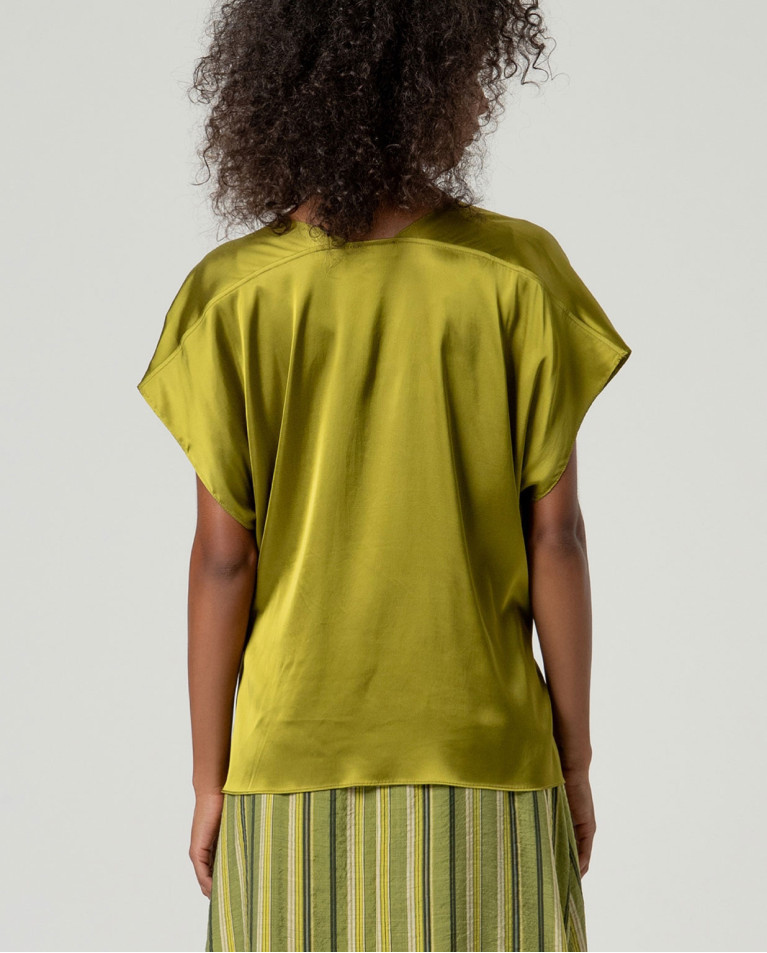 V-nyakú, rövid ujjú, lenge drapéria blúz.