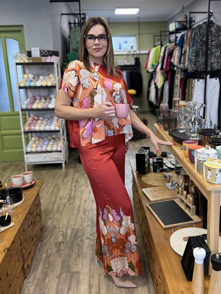 Köpeny stílusú blúz kerek nyakkivágással és testhezálló ujjakkal.