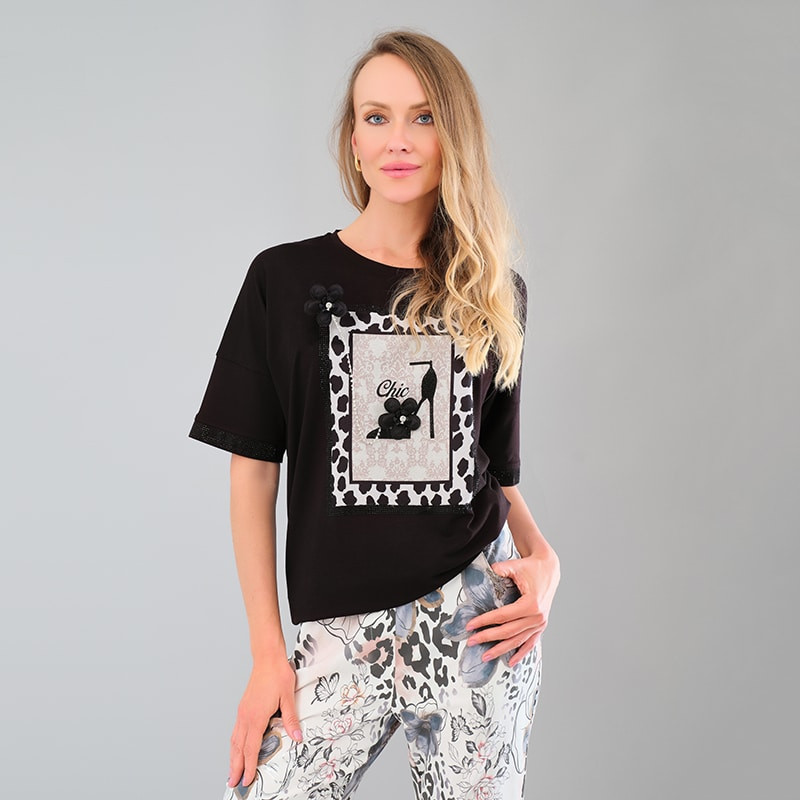 Egyenes szabású, lekerekített szegéllyel, fekete strasszokkal díszített ujjakkal és fekete applikációval az elején.